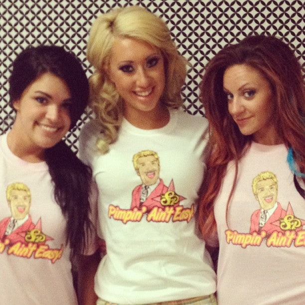 I am proud to announce the launch of the first official Pimpin’ Ain’t Easy t-shirt. Each shirt is shipped to you individually sealed and wrapped with a complimentary SP logo sticker and collectible card. The shirts jump out at you with their vivid colors and sharp design.